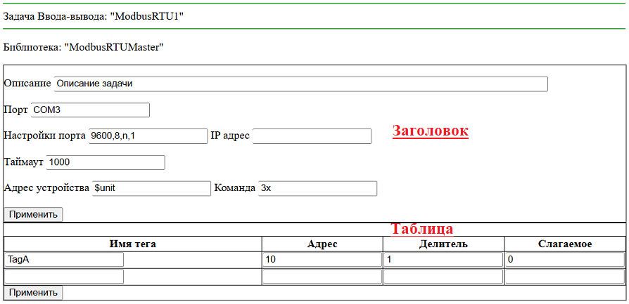 | 7 | Команда | Текст: Modbus команда: 1x чтение битов, 2x чтение входных битов, 3x чтение регистров, 4x чтение входных регистров, 3(4)xu чтение регистров без знака, 3(4)xd чтение двух регистров в один тег, 3(4)xud чтение двух регистров в один тег без знака, 3(4)xds чтение двух регистров в один тег в обратном порядке, 3(4)xf чтение двух регистров float, 3(4)xfs чтение двух регистров float в обратном порядке, 5x запись одного бита, 15x запись битов, 6x запись одного регистра, 16x запись регистров, 6(16)xu запись тега без знака, 6(16)xd запись тега в два регистра, 6(16)xud запись тега в два регистра без знака, 6(16)xf запись тега в два регистра float |