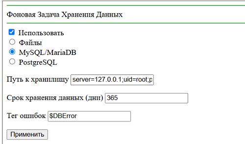 | 4 | Срок хранения | Число: количество дней, в течение которого будут храниться данные. Устаревшие данные будут автоматически стираться. Применимо только при хранении данных в файлах. |